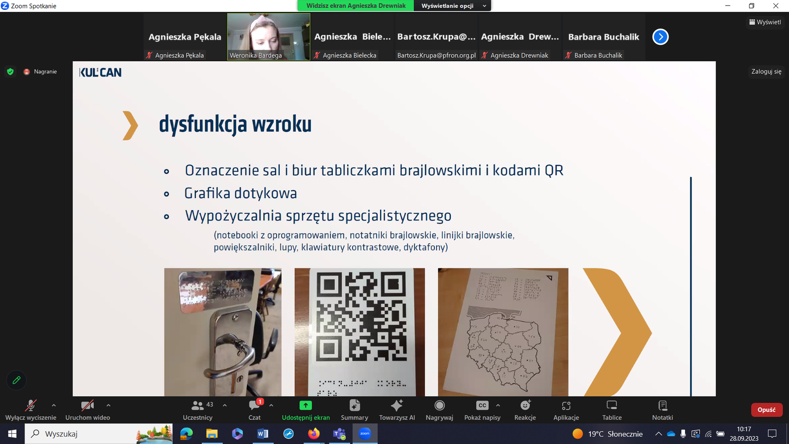 Dziękujemy prelegentom za inspirujące wystąpienia,Barbarze Buchalik - koordynatorowi dostępności z Wojskowej Akademii Technicznej,Weronice Bardędze -studentce KUL, Aleksandrze Derlukiewicz i dr inż.Tomaszowi Grudniewskiemu z Akademii Bielskiej im. Jana Pawła II oraz Agnieszce Drewniak -ekspertowi ds.dostępności PFRON .