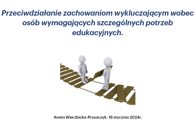 W ramach wsparcia studentów ze szczególnymi potrzebami w dniu 18 stycznia 2024 roku przeprowadzono pilotażowe szkolenie w temacie - PRZECIWDZIAŁANIE ZACHOWANIOM WYKLUCZAJĄCYM WOBEC OSÓB WYMAGAJĄCYCH SZCZEGÓLNYCH POTRZEB EDUKACYJNY.